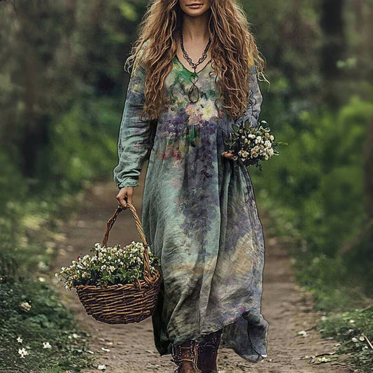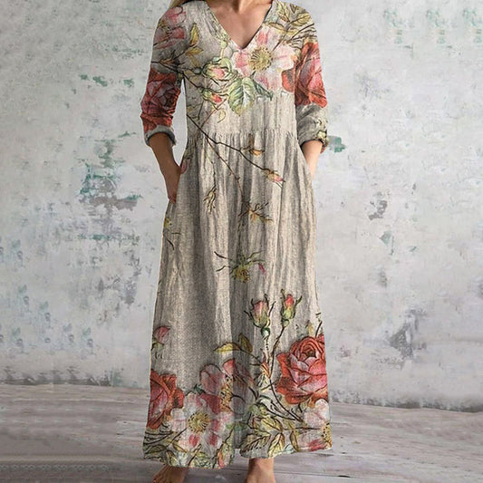 Women's Vintage Floral Pattern Art Print Pocket V-neck Cotton Dress